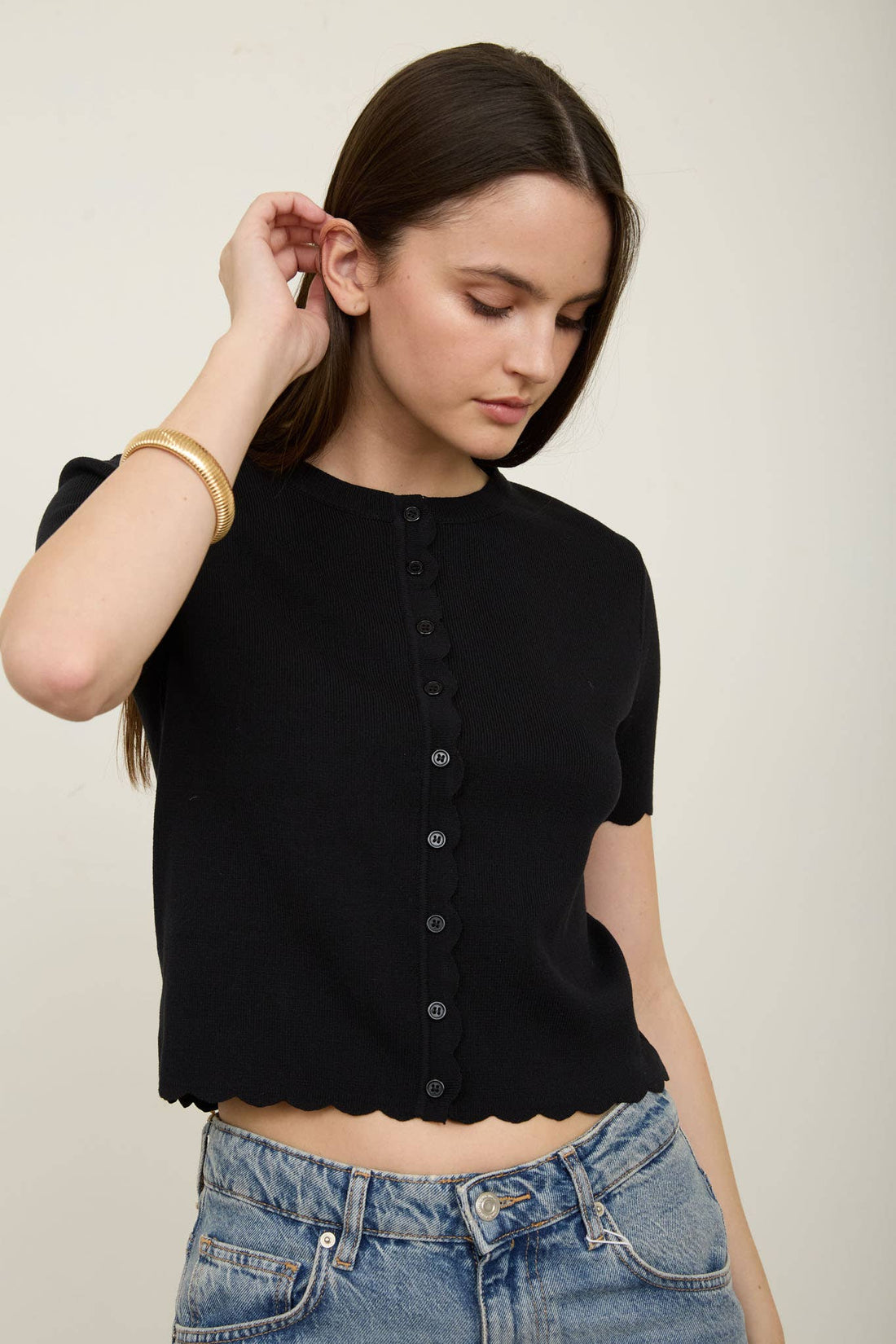 Black - Scalloped Short Sleeve Button Down Cardigan