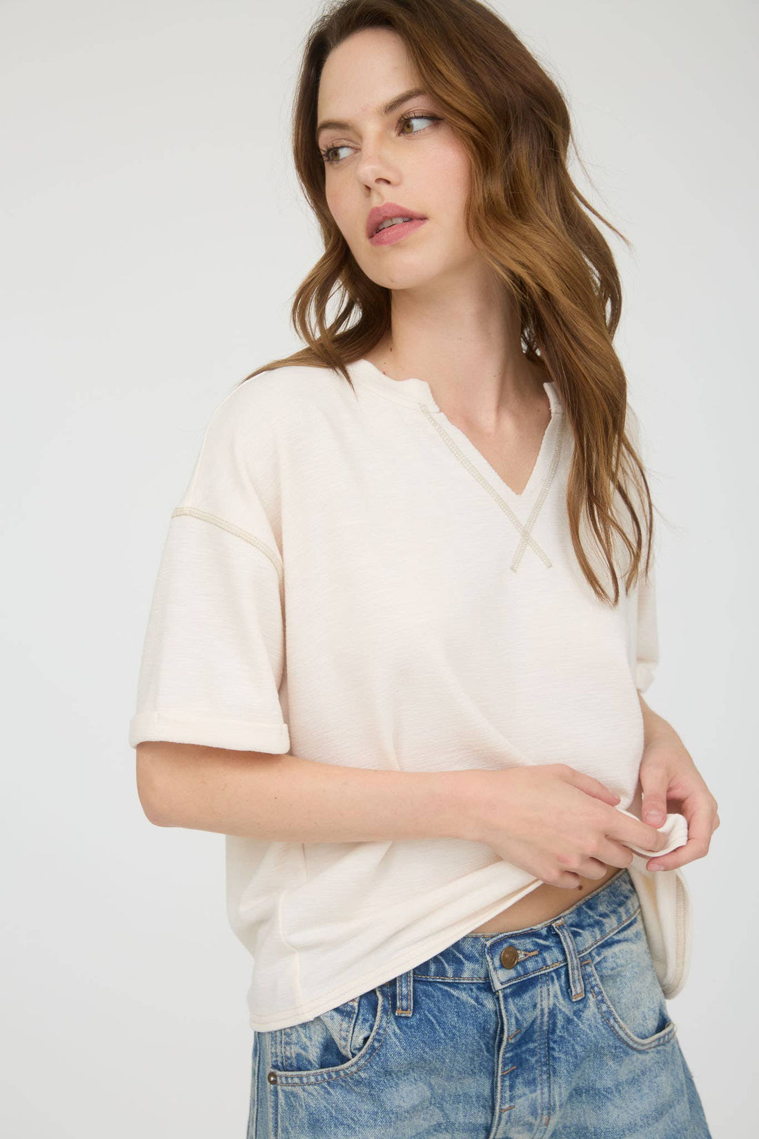 Cream Stitched Drop Shoulder Knit Top