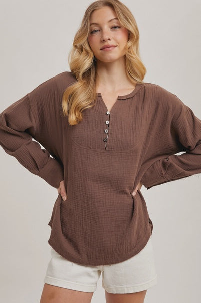 Mocha Cotton Linen Loose Fit Half Button Up