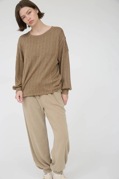 This brown marled long sleeve ribbed knit top embodies refined simplicity. The carefully crafted marled yarn creates subtle visual texture, while the ribbed construction offers a polished, streamlined silhouette. A wardrobe cornerstone that transcends seasons, it pairs seamlessly with tailored trousers, midi skirts, or layered beneath structured outerwear. The understated brown palette speaks to timeless taste and versatility. Experience the quiet confidence of a piece designed for those who appreciate quality craftsmanship and enduring style.