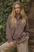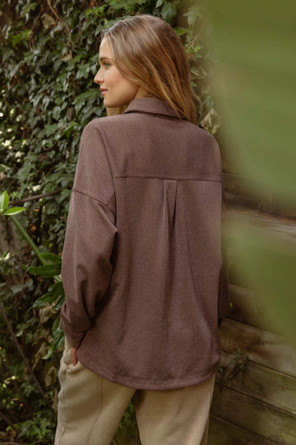 This brown oversized shacket bridges the gap between shirt and jacket with effortless sophistication. The classic pinstripe pattern adds visual interest while the relaxed, oversized fit allows for layering versatility—wear it open as a statement layer or buttoned for structured warmth. The collared neckline and button-front closure deliver polished styling, making it equally at home over a fitted tee or dress. A refined layering piece that elevates any seasonal wardrobe.
