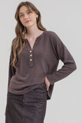 Charcoal Half Button V Neck Long Sleeve Knit Top