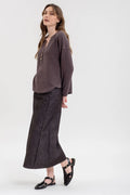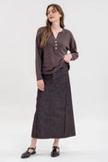 This charcoal knit top combines understated elegance with practical styling through its half-button v-neckline and long sleeves. The v-neck creates a flattering neckline while the half-button front allows you to adjust coverage and layering options throughout the day. Long sleeves provide warmth and extend styling versatility across seasons, while the charcoal hue offers a sophisticated neutral that coordinates effortlessly with your existing pieces. A refined layering staple with timeless appeal.
