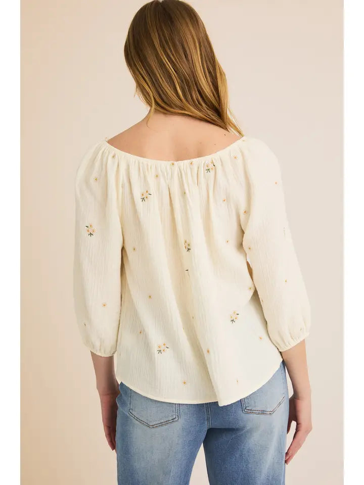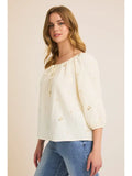 Cream Ivory Floral Round Neck 3/4" Sleeve Tie Top