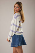 Snuggle up in this delightfully soft cream and lavender sweater that's basically a warm hug you can wear. The long sleeves and gentle color combo make it your new go-to for those "I want to feel cozy but look put-together" moments. Whether you're curling up with a book, running errands, or just vibing at home, this sweater strikes the perfect balance between comfort and style. Layer it, wear it solo, or throw it over your favorite tee—it's the sweater that plays well with everything in your closet.