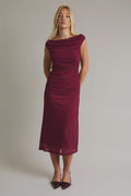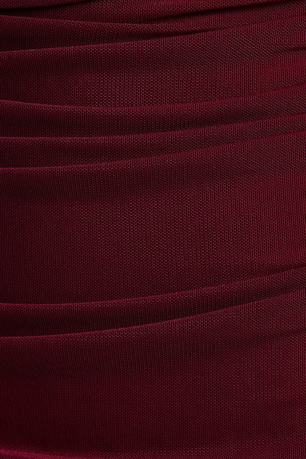 This dark rose midi dress exemplifies contemporary elegance through thoughtful design details. The off-shoulder cut creates a refined neckline while the sheer mesh fabric introduces textural sophistication. Strategically placed ruching provides both visual interest and flattering contouring that enhances your natural silhouette. The midi length offers versatility for various occasions, from upscale events to refined casual outings. A polished choice for those who appreciate quality construction and understated glamour.