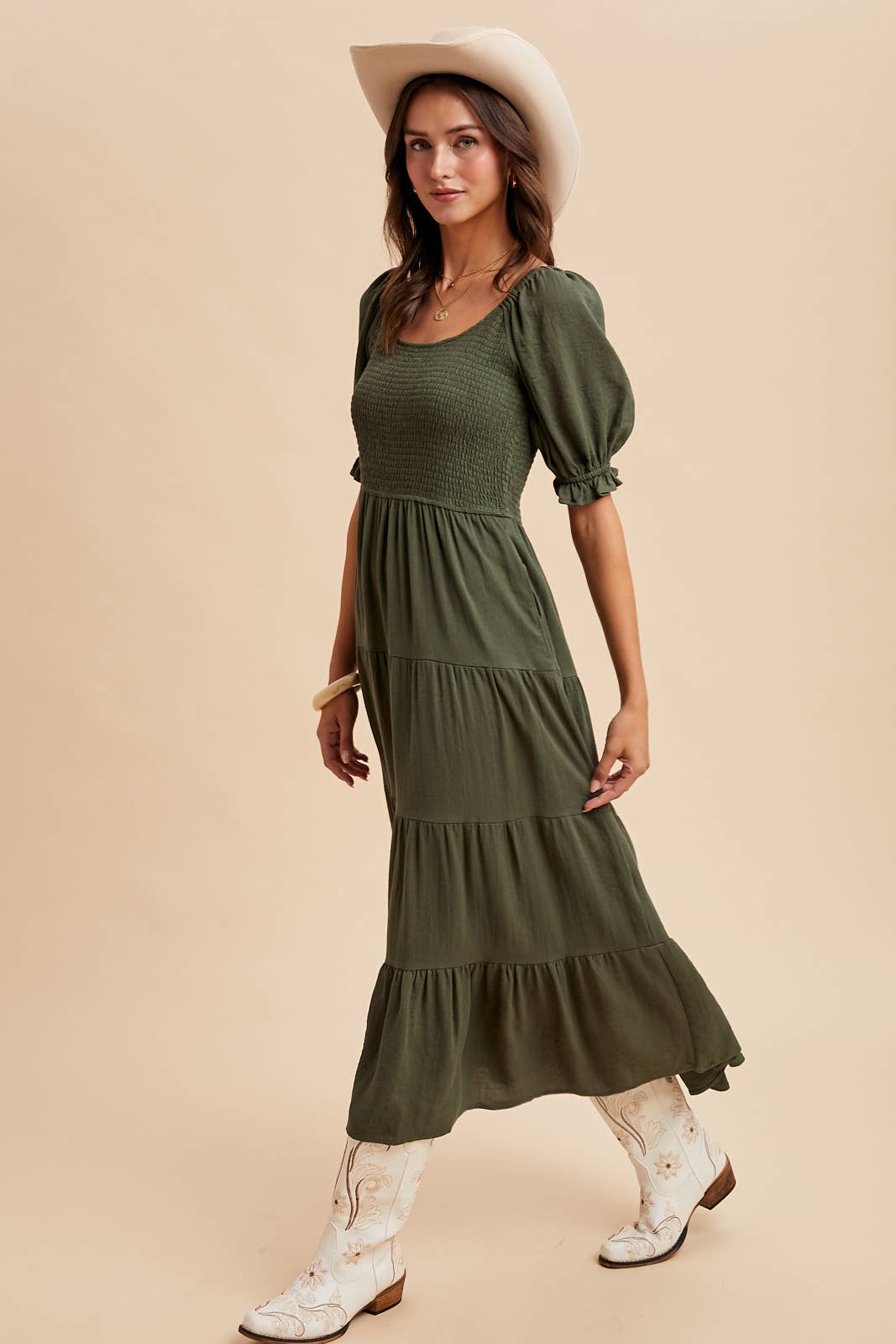 This Forest Green Smocked Tiered Maxi Dress combines elegant design with effortless comfort. The finely smocked bodice ensures a flattering fit, while the tiered skirt flows with refined grace. In a deep forest green shade, it offers a sophisticated silhouette perfect for both formal events and stylish daywear.