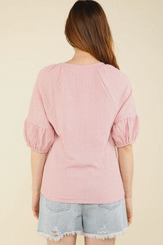 The Half Puff Sleeve Crinkle Knit Top offers a perfect blend of texture and style with its unique crinkle fabric and elegant half puff sleeves. Comfortable and flattering, this top is ideal for adding a sophisticated touch to your everyday wardrobe.