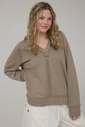 Light Mocha Hooded V Neck Raw Edge Knit Top