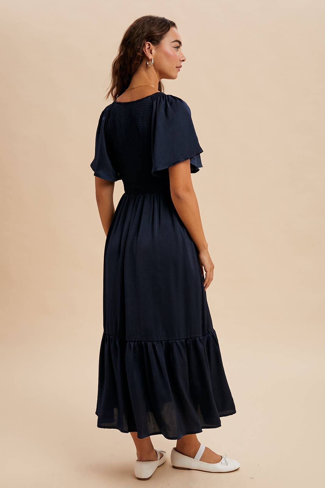 The Midnight Smocked Washed Satin Midi Dress embodies timeless elegance with its smocked detailing and luxuriously soft satin fabric. Designed to flatter with a comfortable, fitted bodice and flowing midi skirt, this dress showcases a rich midnight shade perfect for sophisticated evening gatherings or special occasions. Its washed satin finish adds subtle texture and depth, creating a graceful yet modern silhouette that exudes understated glamour.