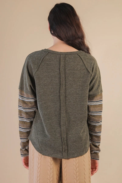 This olive knit top is here to support your style journey with its thoughtfully designed contrast striped sleeves. The soft knit fabric feels wonderful against your skin, while the understated olive tone works beautifully with pieces already in your closet. Whether you're dressing for work, weekend adventures, or cozy nights in, this top adapts to your needs. The striped sleeve detail adds just enough personality to make you feel confident and put-together. We believe you'll love how this piece becomes a reliable favorite you reach for again and again.