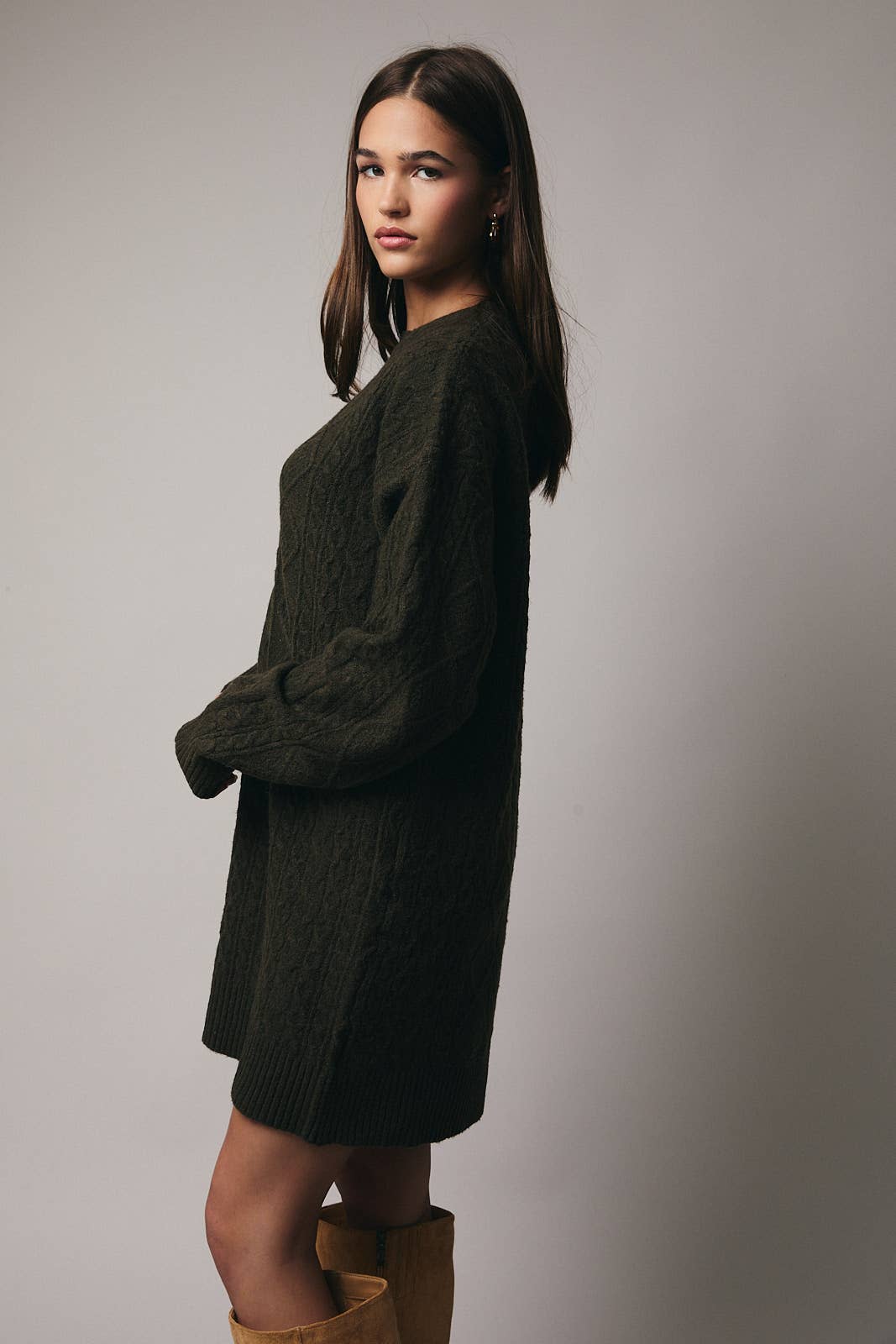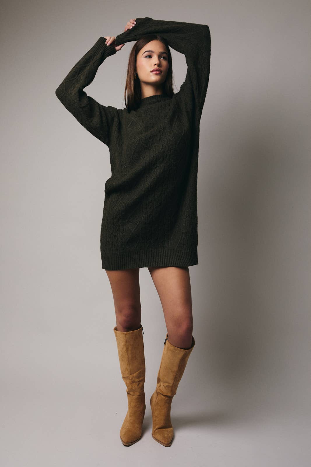 Refined and effortlessly elegant, the Olive Round Neck Cable Sweater Dress features a timeless cable knit pattern that adds subtle sophistication. Its smooth round neckline complements a streamlined silhouette, making it ideal for both polished daytime looks and chic evening affairs. Crafted to provide both comfort and style, this dress is a versatile staple for the modern wardrobe.