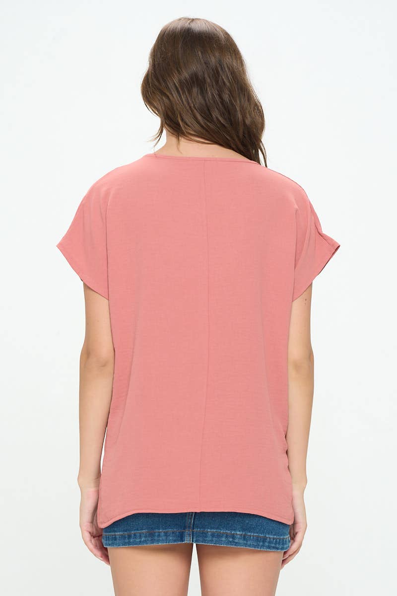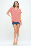 The Salmon V Neck Mimi Top offers a chic silhouette with its elegant V neckline and delicate salmon shade. Crafted to provide both comfort and style, this versatile piece seamlessly transitions from day to evening, bringing a subtle yet sophisticated charm to any ensemble.