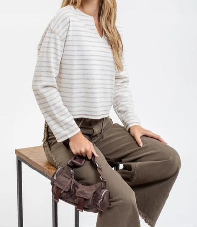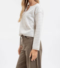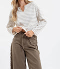 This knit top features a relaxed fit with a split neckline, long sleeves, and drop shoulder design. The stripe and marled patterns add an elegant touch, while the material composition of 96% polyester and 4% spandex offers a comfortable and durable wear.