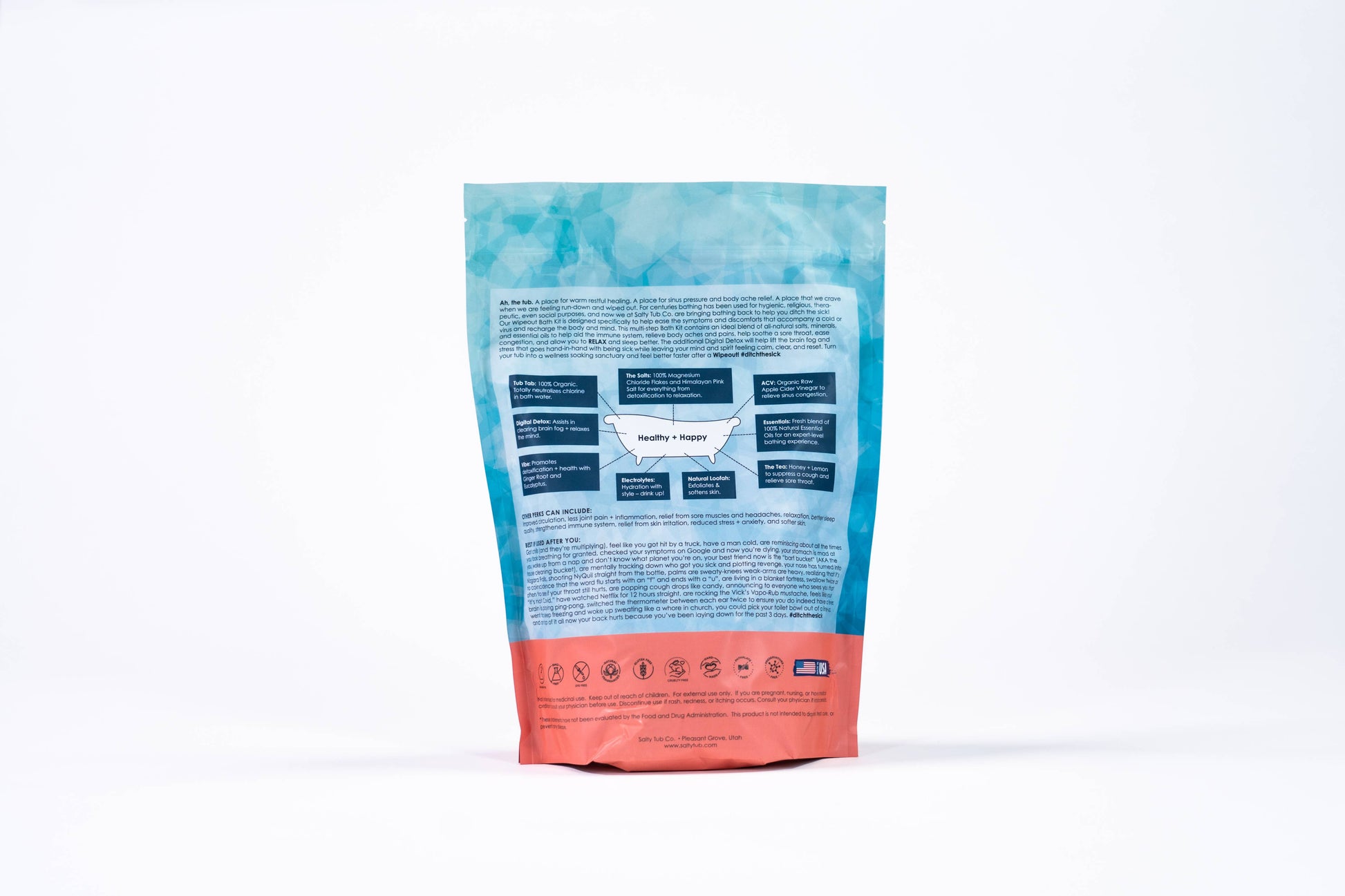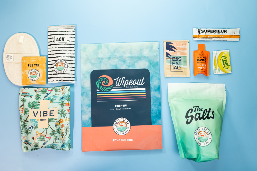 NEW!! The Wipeout Cold + Flu Bath Kit! The perfect pick-me-up when you are feeling under the weather. The Wipeout comes with everything you'll need to combat the congestion, brain fog, body aches, chills, coughing, insomnia, etc. that make life miserable when you're sick. With over a pound of Magnesium Chloride in each Bath Kit to aid your body's natural detoxification process, soothe body aches + pains, get a good night sleep, and boost immunity! The Essentials + Vibe are packed with big hitting, all natural essential oils to calm the mind, clear congestion, and elevate your mood. And, we've added a pack of honey + lemon tea to soothe sore throats and help suppress coughing. You'll be grateful to have a few on-hand when you find yourself surrounded by used Kleenex and a VapoRub mustache!